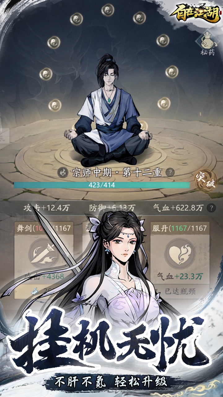 「江湖挑战」「个人历练」「武林事件」三大种类多样玩法,战斗副本全自动挂机,解放双手节约时间,让您武力轻松提升!